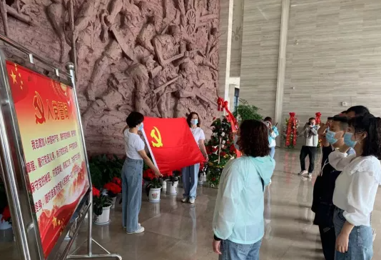 在莊嚴的紀念館序廳革命先輩浮雕前,全體黨員干部面對鮮紅的黨旗重溫了入黨誓詞。